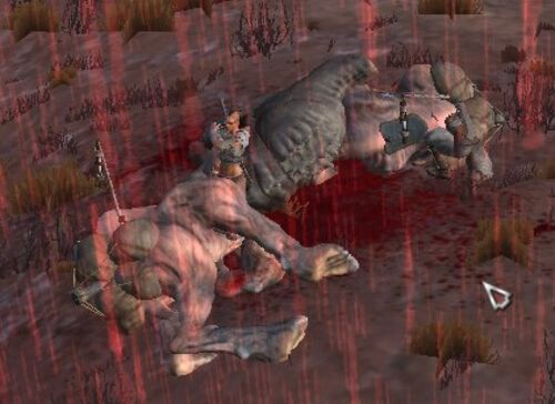ヴェイン峡谷の遺跡で青本を回収。 ガルとビークシングが相打ちで倒れている路上の死体にビクビクしながら、赤い川沿いに北上していく。 紙装甲のマスター&ボーがビークシングの群れに襲われたらひとたまりもないかも…… おっかなびっくり、慎重に周囲を警戒…