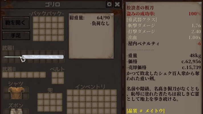 攻撃49、防御55、筋力85、と、魔境のザコと互角に戦える程度のステータスではあるが、やや不安。