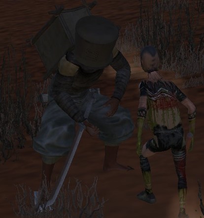 おっと、何と戦ってたかはよくわからないが、ボロボロの奴隷商が1人、仲間とはぐれてフラフラ歩いてるじゃないか……