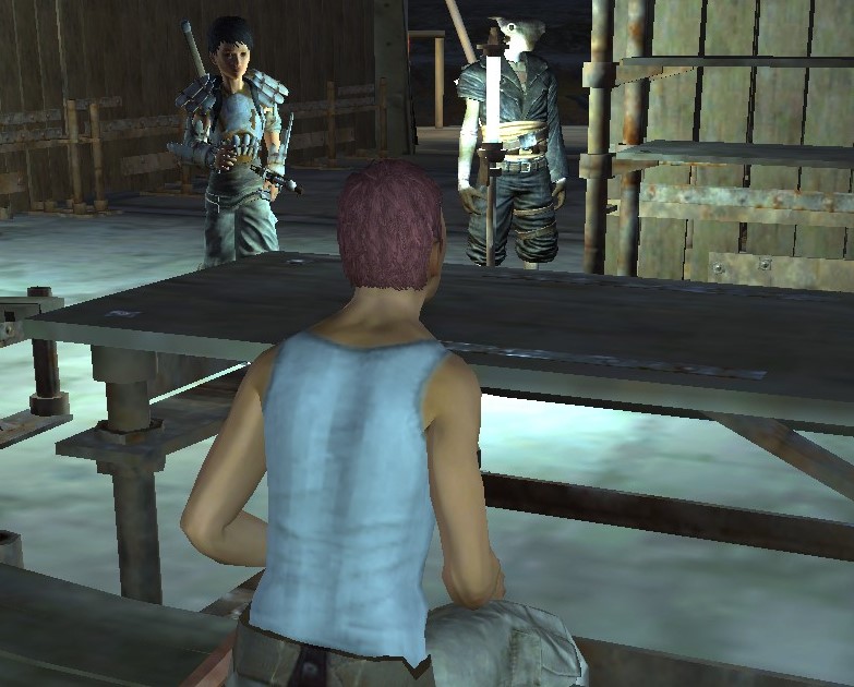 怪訝そうな顔でクロトを睨む、大柄な労働者の女性。