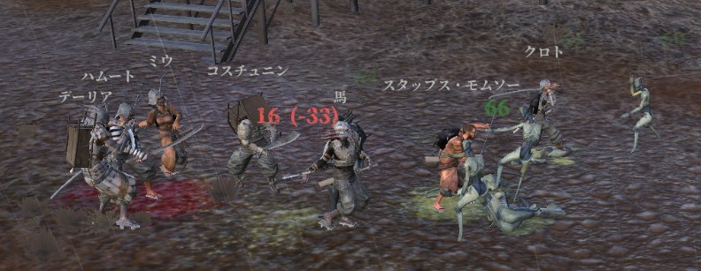 ハムートが気合と共にゾンビを斬り伏せて行く中、味方の誤射と思わしき弾丸に倒れた奴隷市の衛兵の姿が彼の目に留まる。
