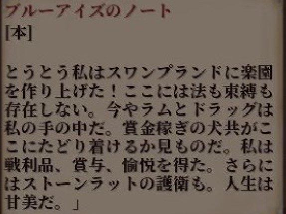 麻薬を密輸し、貴族を堕落させ、その弱みを握って恐喝する一方、自らはスワンプに君臨する事なくここでこうして安酒を飲んでいる。