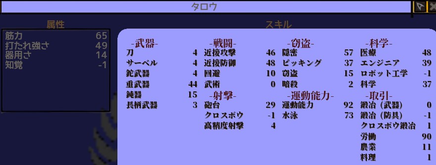 武術は31まで伸びたが、意外と攻防が低い。まだまだ修行が足りないな。