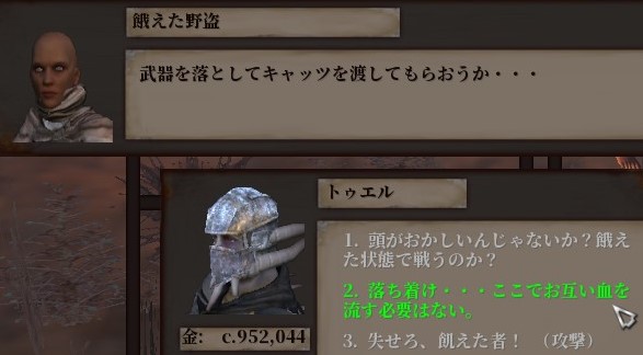 飢えた野盗相手の施しモードの会話が発生。