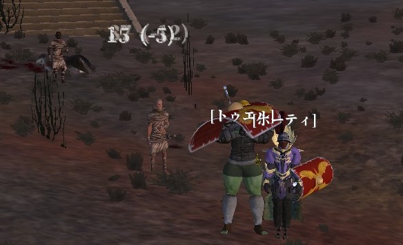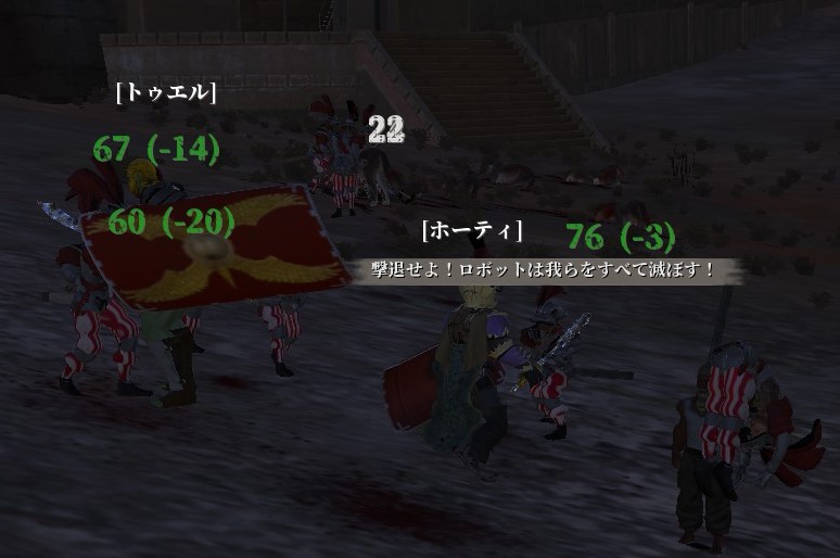 挑発ボタンONが効いたのかどうかは分からないが、タゲ取りタンク捨てがまり作戦は上手く行き、大量の敵兵がホーティに群がる。
