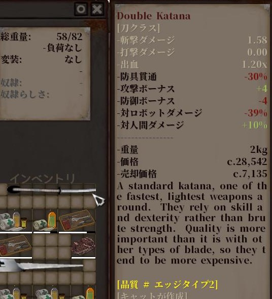 斬1.58 打0.00 出血1.20x 貫通-30% 攻+4 防-4 対ロボ-39% 対人10% 2kg c28542 1*7